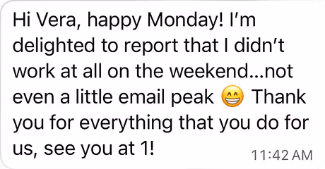 Let’s break it down: you’re investing in years of experience, focused energy, strategic input and timely execution. And consider what you’re not paying for: benefits, holidays, payroll admin, contributions, insurance, equipment. But it’s not about the hourly rate alone, the ROI is in how this kind of support quietly reshapes your day-to-day. Like booking a spontaneous trip without wondering what’ll pile up while you’re gone. Or baking fresh cookies on a Tuesday afternoon just because you can. Please remember, success is a feeling!